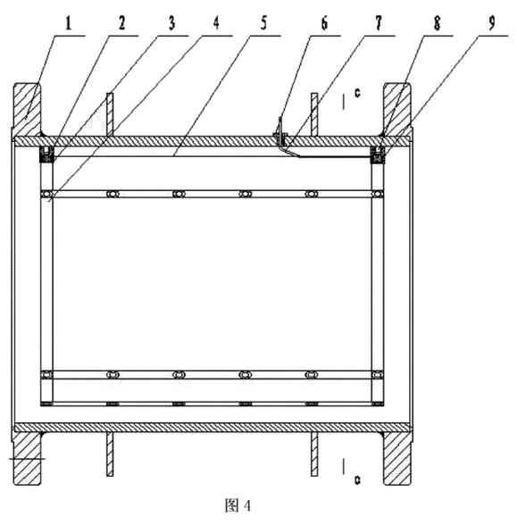③、將兩個環狀內襯筋板4通過其筋板上開有的數個通孔分別放到電磁流量計導管1內壁兩端固定的一圏數個絕緣支柱2上,將數個連接板5通過其條板上開有的數個通孔軸向放置在電磁流量計導管1內壁內固定的數個絕緣支柱2上,數個連接板5兩端與兩個環狀內襯筋板4搭接在一起,同時在靠近電磁流量計導管1上固定的出線螺栓6一端的內襯筋板4和連接板5搭接處之間,放置一個焊有耐高溫導線7的焊片9;