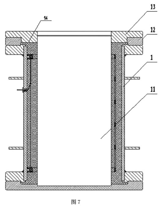 ⑦、將倒入聚氨酯樹脂膠10的電磁流量計導管1放入110℃的硫化罐中進行硫化,10小時后,撤掉襯膠模具11繼續硫化24小時后完成襯膠。
