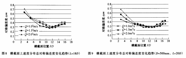 圖7以曲線的形式給出了不同橫截面速度分布總對稱偏差度的變化趨勢。從圖7可以看出,沿著直管流動方向,總對稱偏差度先減小后增大,*小值在ι=lOD(Q=1.0m3/s)和11D(Q=1.5m3/s和2.0m3/s)位置處。這是由于在靠近上游彎管和下游彎管的直管,流動受彎管的影響,且上游彎管對直管內速度分布影響較大。ι=lOD位置的速度總對稱偏差度比ι=5D位置的降低了很多,流量Q=1.0、1.5和2.0m3/s3個工況下,速度總對稱偏差度分別減小了0.3065、0.1642/0.1907。由此可見,由于速度分布對稱度大幅度的提高,電磁流量計安裝在ι=lOD位置時流量計量的準確度將大大高于電磁流量計安裝在ι=5D位置。