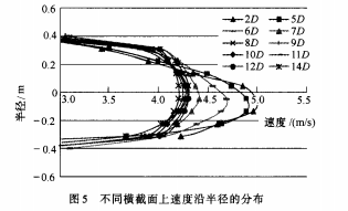 不同橫截面(ι=2D、5D、6D、……、14D)上速度沿著半徑的分布見圖5。從圖5可以看出,在ι≤7D的橫截面上,速度分布明顯不對稱,且隨著ι的增大,速度軸對稱情況逐漸好轉;在其它橫截面上,速度分布趨于對稱。