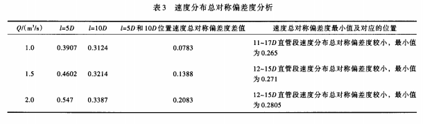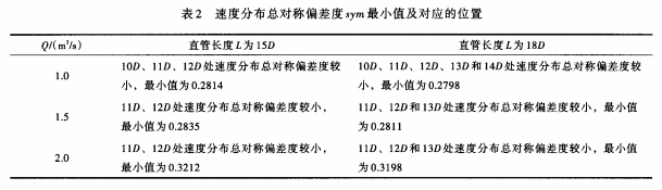 4.1.3 800mm內徑電磁流量計測量管路設計分析 根據上述計算結果統計出不同過流量、不同直管長度,速度分布總對稱偏差度的*小值及對應的位置,見表2。從表2可以看出,當直管長度L取12m和14.4m時,均有部分位置的速度分布總對稱偏差度較小,且兩種直管長度下總對稱偏差度*小值相差很小。以Q=2.0m3/s為例,L取12m和14.4m時,總對稱偏差度*小值分別為0.3212和0.3198,差值為,0.0014。由此可見,當測量直管長度達到一定值時,繼續延長測量直管長度并不能顯著改善管內速度的軸對稱分布情況。
