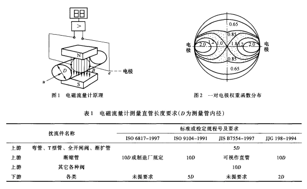 盡管電磁流量計生產廠家不斷追求流量計本身的精度,電磁流量計的設計和工藝技術在不斷提高,但實際測量中,工藝管道中的彎管、閥門等都會引起流動畸變、二次流或漩渦,水流只有經過相當長的直管,管內流速才能呈中心軸對稱分布。對電磁流量計上、下游直管長度的要求是保證流速呈中心軸對稱分布,獲得儀表測量精確度的必要條件之一。各標準或檢定規程提出了電磁流量計所要求的上、下游直管長度,如表1所示,要求比通常要求高,這是為了保證達到0.5級精度儀表的要求。ISO6817—1997是電磁流量計應用標準,該標準規定,對任何類型的擾流件,電磁流量計上游至少應有10D(測量管內徑)長度的直管,性能變動才能保證不超過1%。ISO9104—1991是電磁流量計性能評定標準,JJG198—1994是我國速度流量儀表通用檢定規程,雖然也適用于電磁流量計,但較簡單,而ISO9104—1991比較詳細。