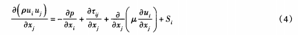 式中:p為流體密度;u為速度;P為壓力;r為雷諾應力;x為空間坐標;μ為動力黏度;S為源項,指標i、j表示坐標軸方向分量,遵從張量中的求和約定。