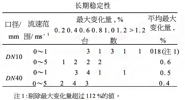 在長達兩年牛的實驗周期內,每進行一輪試驗,先做一次參比液體和參比條件的基本誤差,k這些數據進行比較,即可獲得各臺儀表的長期穩定性°表6所示是反映長期穩定的基本誤差*大變化量臺數分布狀況和均變化量。不均量大變化量在014%~018%之間。