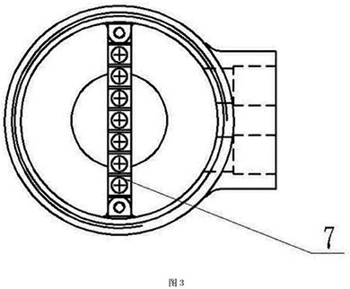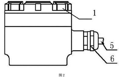 本實(shí)施例如圖4所示,分體接線盒用4只M6的螺釘8將殼體3與固定在流量傳感器7上端,殼體3與傳感器7之間采用橡膠密封墊9密封。端子排7用兩個(gè)M4的螺釘固定在殼體內(nèi),接線端子通過(guò)連接電纜5,穿過(guò)安裝在殼體上的格蘭頭6連接到變送器。分體蓋l通過(guò)螺紋擰緊在殼體3的上端,分體蓋1與殼體3的密封采用O型圈密封。使用時(shí)電纜與管道軸線方向一致,管道為垂直方向時(shí),電纜出線方向朝下,從而不會(huì)造成外部的液體流