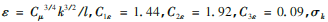 本文的湍流模型采用工程上使用zui**的標(biāo)準(zhǔn)k-ε模型,需要求解湍動(dòng)能及其耗散率方程。在該模型中,有關(guān)湍動(dòng)能k和耗散率ε的運(yùn)輸方程如下