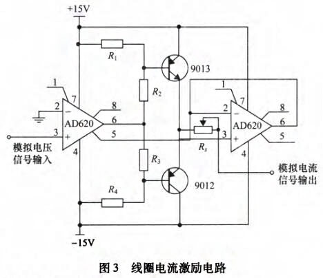 感應電壓檢測模塊主要由勵磁電路和弧狀電極傳感器組成,其中勵磁電路用來在流體測量區(qū)域產(chǎn)生盡量均勻的磁場分布,而內(nèi)嵌在管道內(nèi)壁與流體接觸的弧狀電極傳感器則負責拾取帶有流體速度參數(shù)的感應電壓信號。為在流體測量區(qū)域產(chǎn)生盡可能均勻的磁場,勵磁線圈采用馬鞍形線圈。在勵磁系統(tǒng)設(shè)計中,鐵芯可以提供磁通路徑,從而改變磁場分布,并加強磁感應強度。同時,為降低鐵芯渦流損耗以及增加磁路導磁系數(shù),鐵芯采用表面涂有絕緣漆的薄硅鋼片疊加而成。在鐵芯上套上馬鞍形線圈即組成勵磁系統(tǒng)。直流勵磁使得弧狀電極拾取的感應電壓中存在極化電壓信號,而交流勵磁則會引起的正交干擾和同相干擾。因此,為克服直流勵磁和交流勵磁存在的缺點,設(shè)計采用在線圈中施加頻率∫=6.25Hz的低頻矩形波勵磁方式。勵磁電路主要包括AD620和AD71組成的壓控電流源電路和三極管9013和9012組成的互補對稱推挽型功率放大電路,如圖3所示,模擬電壓信號由PXI模塊的模擬信號輸出端給出。