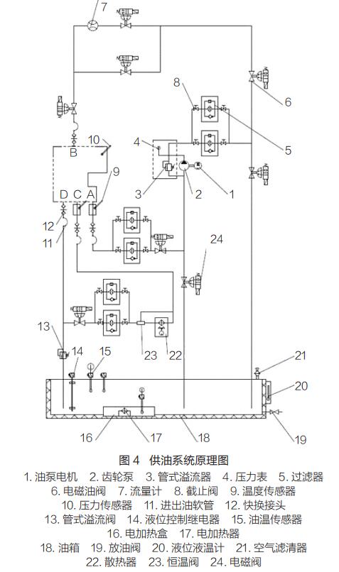 試驗臺供油系統用于提供變速器試驗所需的油壓和流量,保證油溫處于變速器的正常工作范圍內。供油系統原理如圖 4 所示。通過計算機控制系統控制,可實現變速器試驗全過程油液循環過濾、保溫、濾清器堵塞報警等功能。