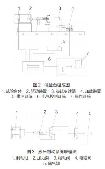 變速器超越離合器可靠性試驗臺主要由試驗臺體 1(試驗平臺、驅動電機支座、前支座、后支座)、驅動裝置 2(驅動電機、聯軸器)、被試變速器 3、加載裝置 4(液壓制動系統)、供油系統 5、電氣控制系統 6、
