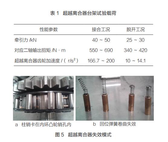 在試驗臺上模擬渦街流量計常見工況的傳動系載荷譜,臺架試驗 1h 等效于整機試驗 1.8h。利用試驗臺進行了 4 次累計600h 的試驗,超越離合器失效模式如圖 5 所示。超越離合器失效主要表現為柱銷卡死在內環凸輪銷孔中,彈簧卷曲、斷裂,以及內環凸輪滾道壓痕明顯,與市場反饋的失效模式基本一致。該試驗臺對市場故障具有很好的再現性,極大縮短了故障驗證時間,減少了整機試驗時的排放和噪聲污染,具有良好的經濟效益和社會效益。■
