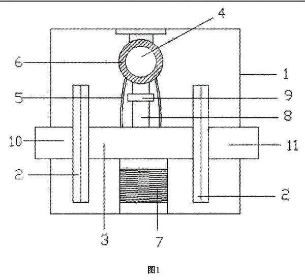 本實(shí)用新型抗震型旋進(jìn)旋渦流量計(jì)將進(jìn)氣口10和出氣ロ11分別通過(guò)連接頭2與殼売體3連接,將流量顯示器4通過(guò)旋進(jìn)螺栓9連接在連接桿8上,再將彈簧7安裝在殼體3底部,將連接桿8包裏在流量顯示器4外側(cè),以達(dá)到保護(hù)旋進(jìn)旋渦流量計(jì)的目的,箱體1作為旋進(jìn)旋渦流量計(jì)第 一道保護(hù)措施,連接桿8和彈簧7作為旋進(jìn)旋渦流量計(jì)第 二道保護(hù)措施,兩者相互配合使用共同保護(hù)旋進(jìn)旋渦流量計(jì)。